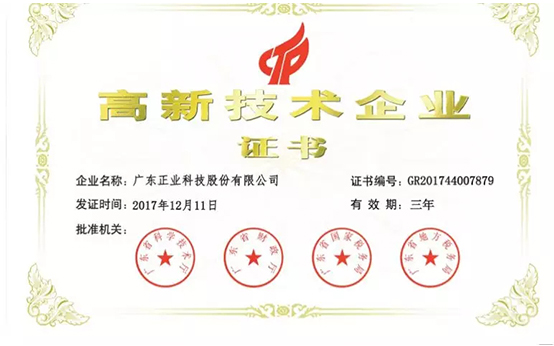 廣東正業(yè)科技股份有限公司憑借雄厚的核心技術(shù)實(shí)力再次榮獲由廣東省科學(xué)技術(shù)廳、廣東省財(cái)政廳、廣東省國家稅務(wù)局、廣東省地方稅務(wù)局聯(lián)合頒發(fā)的高新技術(shù)企業(yè)證書。